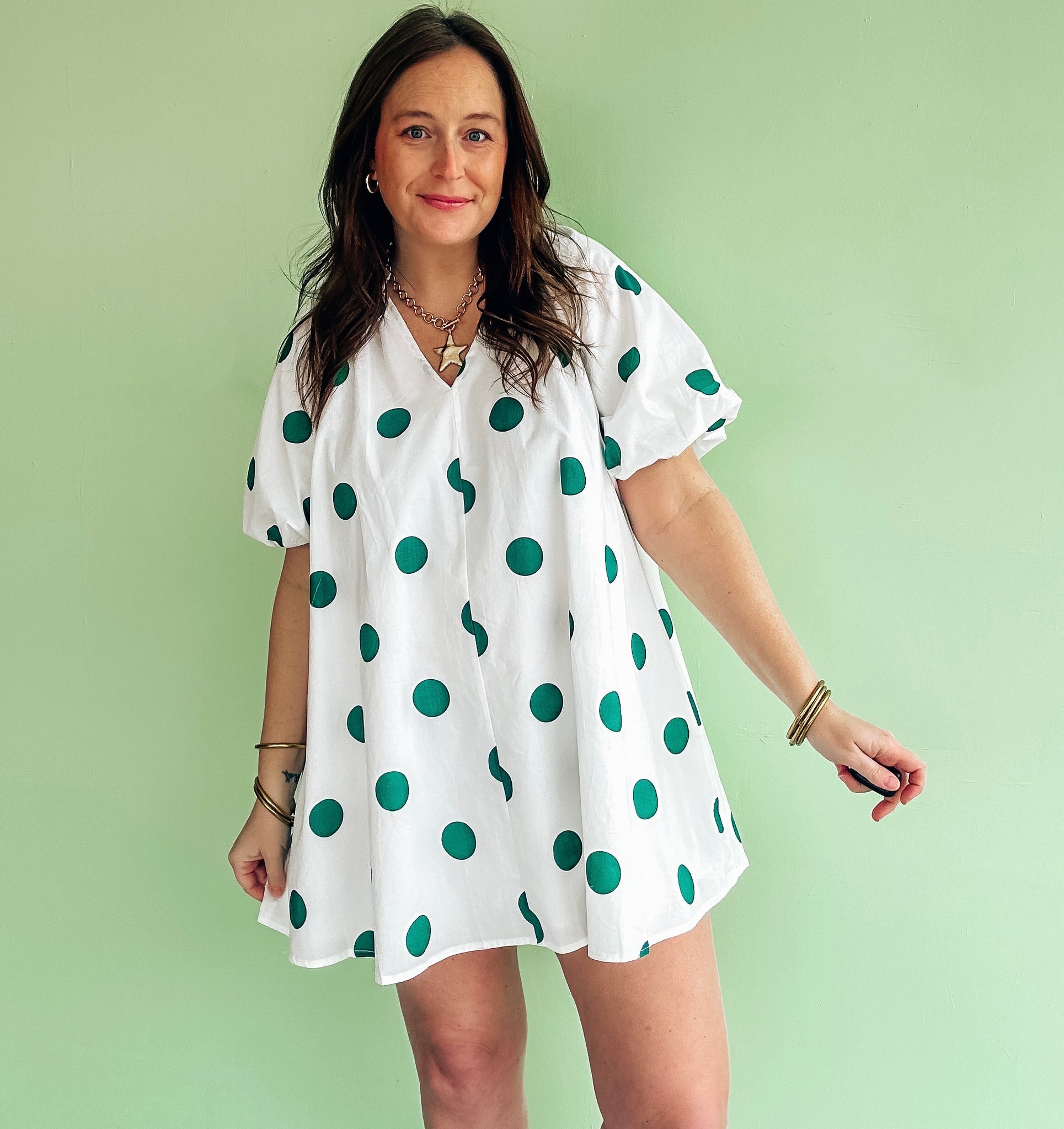 White puff sleeve dress with dark green polka dots all over
