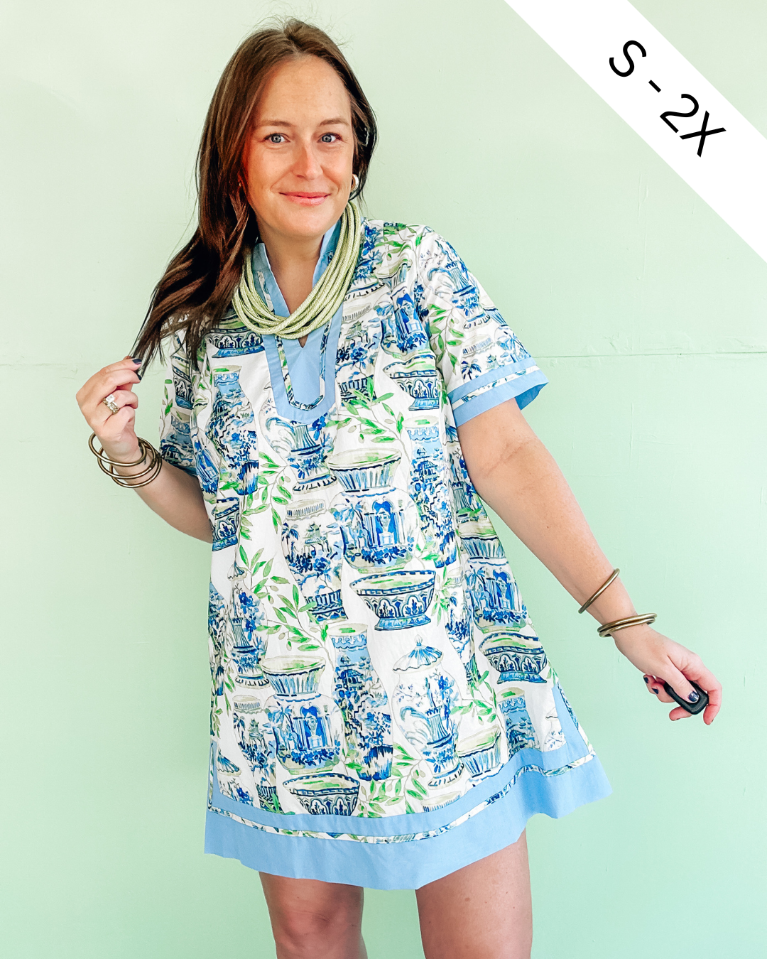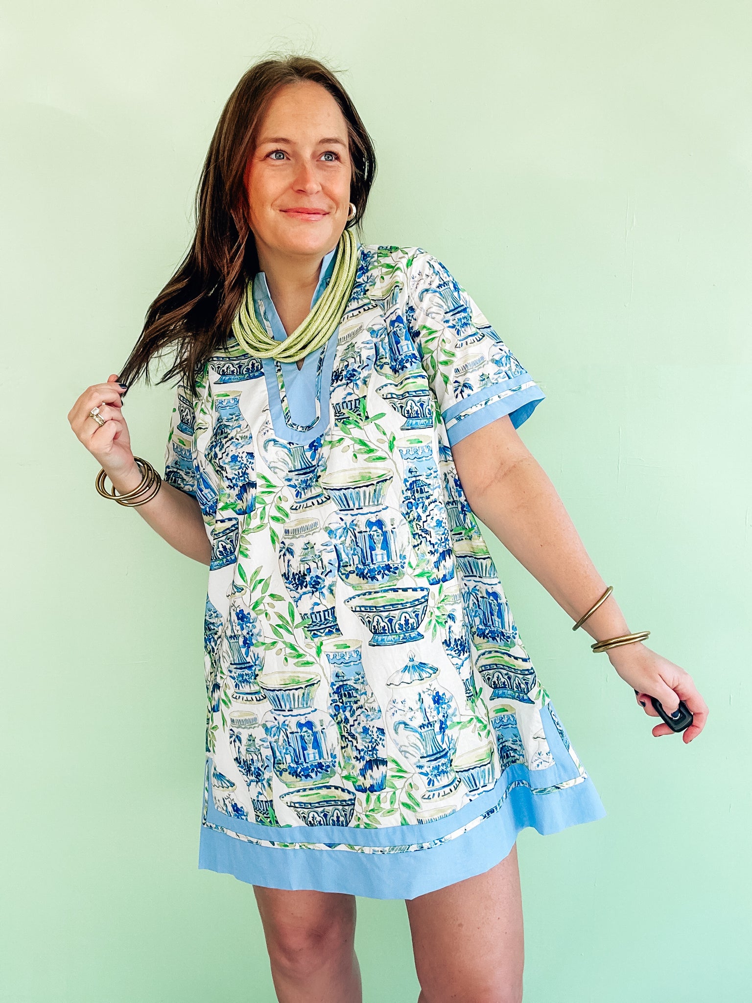 Split V-neck dress with short sleeves & side slits! Features a blue and white ginger jar print all over
