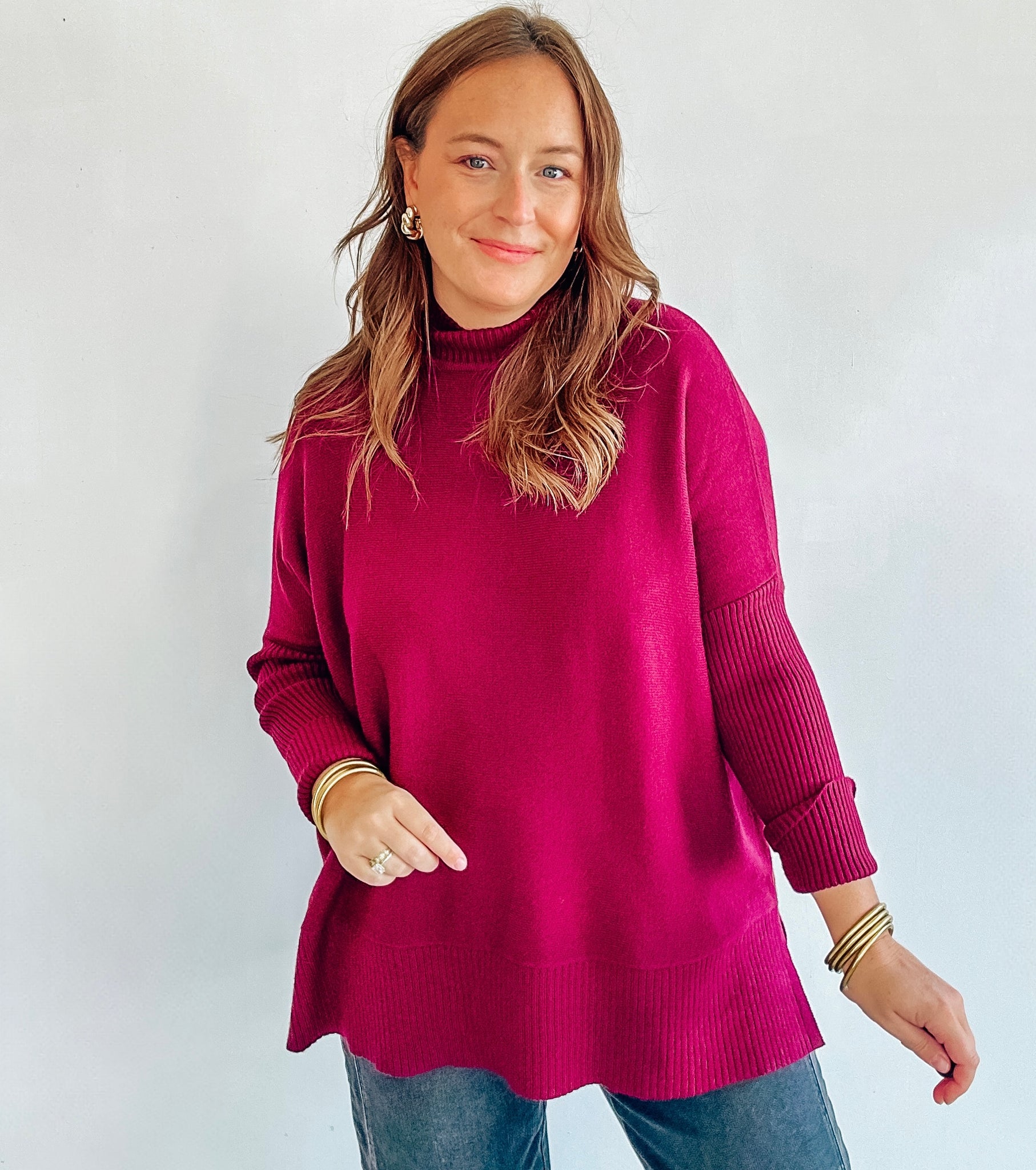 Oversized mock neck sweater with side slits