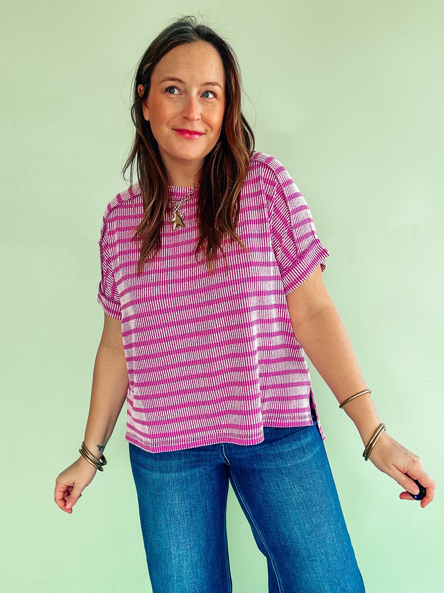 Raised ribbed stripe top with side slits and a hi-low hem
